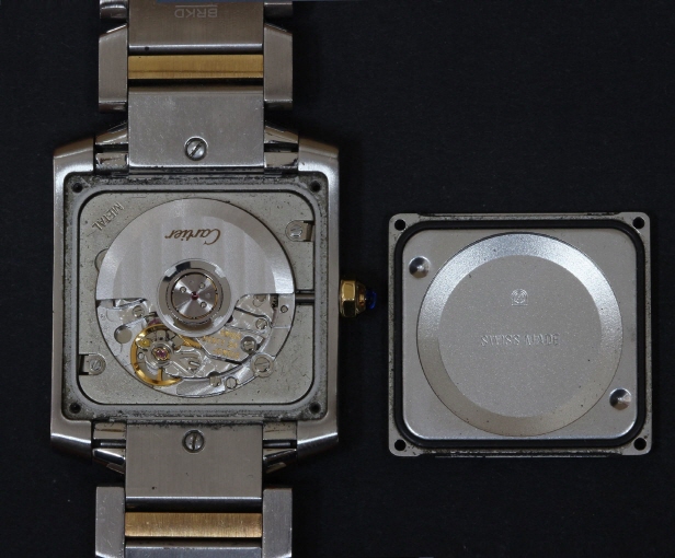 기계에서 문자판과 바늘이 분리된 상태입니다. 까르띠에 고유의 블루핸즈를 볼 수 있습니다.